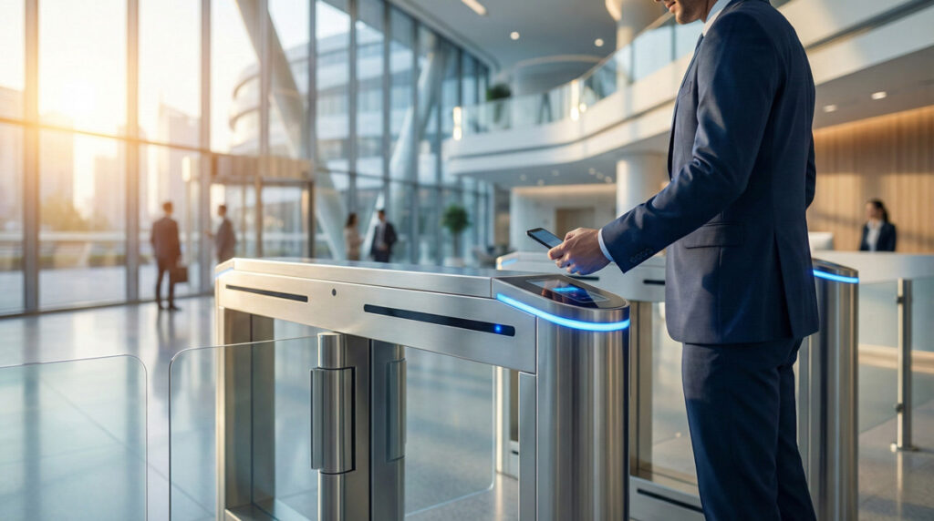 Czasowe karty (proximity, MIFARE DESFire EV3), PIN-kody, odciski palców (biometria), mobilne przepustki (BLE/NFC). Mobilna aplikacja SkyCommand – pracownik używa smartfona zamiast karty fizycznej. Zgodność ze standardami ISO/IEC 14443 (RFID).